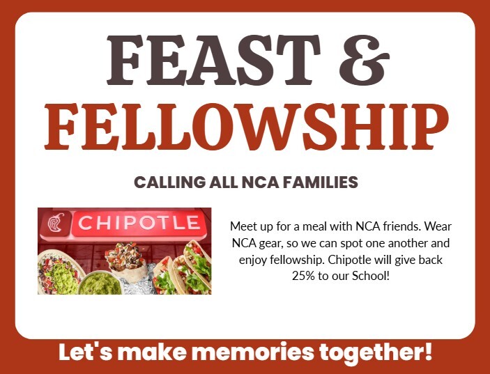 January's Feast and Fellowship is at Chipotle! Enjoy a meal with your family, run into fellow NCA parents, and support our school!Or order online using code 4VKT98F.